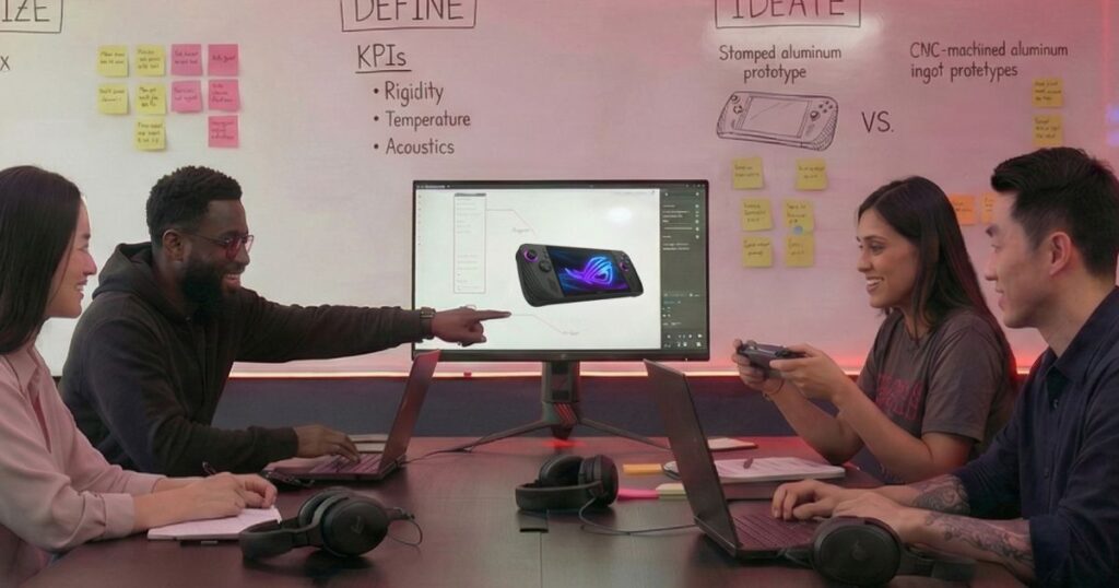 우리의 디자인 사고 프로세스의 완벽한 예는 2025 + 개발에서 볼 수 있습니다. 연구 중에 플레이어들은 섀시 유연성, 공명, 키보드 핫스팟과 같은 문제를 강조했습니다. 우리는 디자인적 사고를 사용하여 의도적인 다단계 프로세스를 통해 이러한 과제를 해결했습니다.