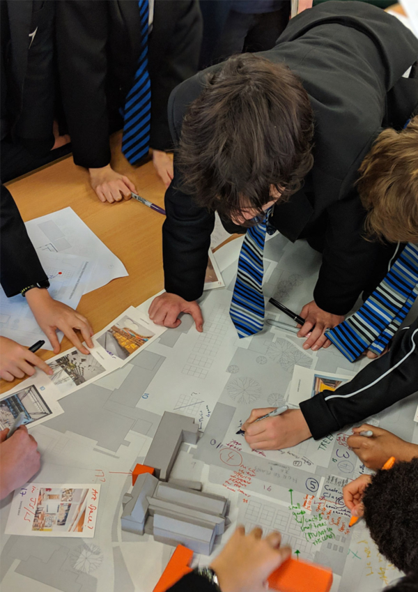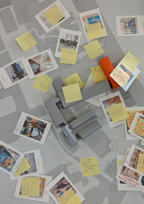 설계 과정에서 알마낙(alma-nac)은 학교 시설 관리팀과 교사, 학생, 사서를 모두 참여시켰다. 이를 통해 지속가능성 목표에 대해 구성원 전반의 공감을 이끌어냈다. 리바(RIBA) 2단계에서 진행된 ‘바우필로텐 방법(Baupiloten method)’ 워크숍은 설계에 필요한 의견을 수렴하는 동시에, 어린 학생들에게 건축 전반을 이해시키는 교육 도구로 활용됐다. 야외 공간, 동선, 도서관과 학습 공간을 담은 이미지 엽서는 새 건물에서 무엇을 기대하는지에 대한 논의를 촉발했다. 이 과정에서 교직원과 학생, 사서들은 주 도서관 공간이 접근성을 높이고 외부 공간과 직접 연결될 수 있도록 반드시 1층에 배치돼야 한다는 데 의견을 모았다. 당초 상층에 계획됐던 도서관의 위치는 이 논의를 거쳐 변경됐다.