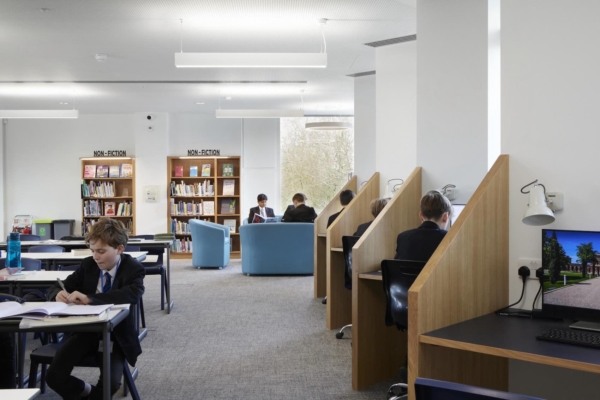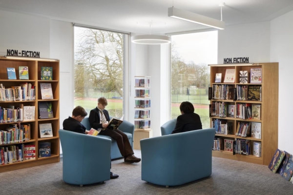 이 사례는 레이먼드 챈들러 도서관(Raymond Chandler Library)은 런던 남부의 덜리치 칼리지(Dulwich College) 로어 스쿨 캠퍼스 재구성의 출발점으로 조성된 신축 도서관이다. 이 건물은 단편적으로 이어져 온 기존 증축의 흐름을 정리하고, 넷제로 탄소 배출이라는 학교의 장기 전략을 건축적으로 구현하려는 시도의 결과물이다. 도서관은 단순한 장서 공간을 넘어, 학생들의 일상적 체류와 학습, 교류가 자연스럽게 이루어지는 중심 공간으로 작동하고 있으며, 개관 이후 도서 대출량이 두 배로 증가하는 등 명확한 이용 성과를 보여주고 있다.