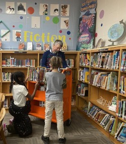 팀 존스가 학생들과 함께 책을 고르고 있다.